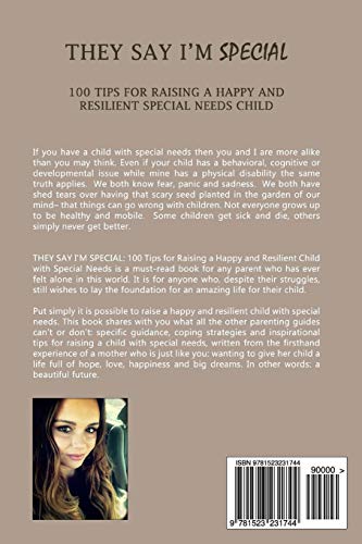 THEY SAY I’M SPECIAL: 100 Tips For Raising A Happy and Resilient Child With Special Needs "If you have a child with special needs then you and I are more alike than you may think. Whether your child has a behavioral, cognitive or physical disability the same truth applies. We both know fear, panic and sadness. We both have shed tears over that scary seed planted in the garden of our mind– that things can go wrong with children. Not everyone grows up to be healthy and mobile. Some children get sick and die, others simply never get better..." THEY SAY I’M SPECIAL: 100 Tips for Raising a Happy and Resilient Child with Special Needs is a must-read book for any parent who has ever felt alone in this world. It's for anyone who, despite their struggles, still wishes to lay the foundation for an amazing life for their child. Put simply it is possible to raise a happy and resilient child with special needs. This book shares with you what all the other parenting guides can’t or don’t: specific guidance, coping strategies and inspirational tips for raising a child with special needs, written from the firsthand experience of a mother who is just like you: wanting to give her child a life full of hope, love, happiness and big dreams. In other words: a beautiful and meaningful future.